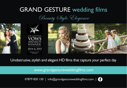 Award winning GRAND GESTURE Wedding Films is Scotland's best wedding film supplier as voted by The VOWS Awards in 2015 & 2014. Based in Edinburgh, we create beautiful bespoke w...