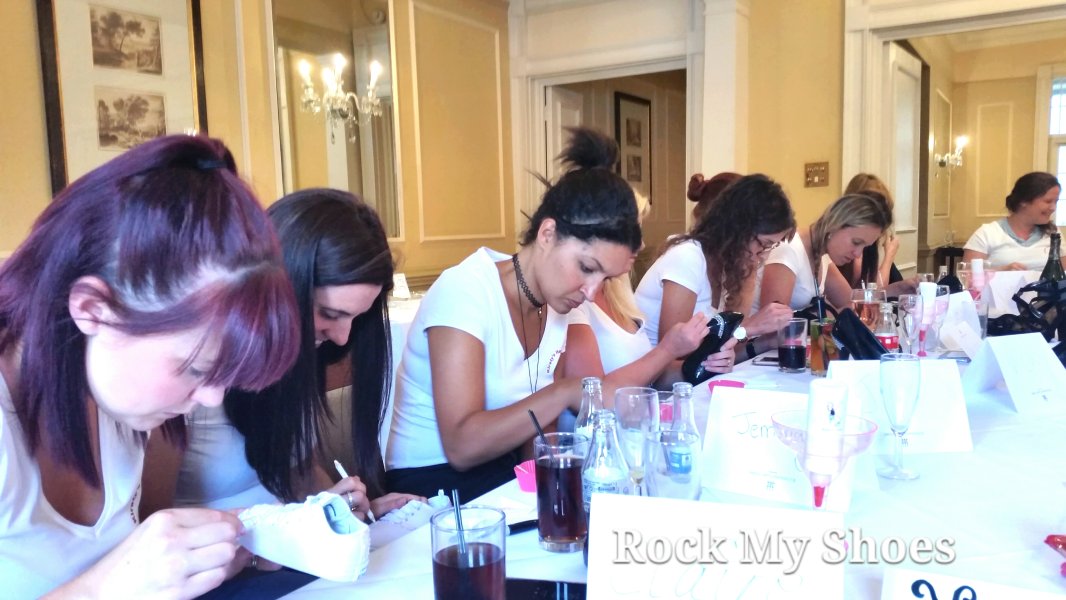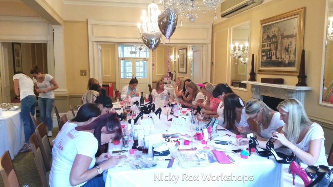 Wedding Shoes, Bridesmaids Shoes and Hen Night Shoes Have you ever wondered what it would be like to personalise your own shoes? You can do just that with Nicky Rox at a Shoe Decorating Craft Workshop! Hear the ooo's and wow's as you see your friends choosing their favourite colours and shapes in a vast selection of crystals, pearls, gems and trinkets, flowing through your fingertips!! Waiting to be applied to your shoes!! Lots of design ideas are handed out to your group, and a selection of customised shoes will be on display. The workshop demonstrates by an introduction to shoe customising methods and you will have all the professional tools you will need. You will have the option to either fully bling up your heels, add your name (or initials) to trainers, add a slogan to shoes or a bag, hide any scratches on heels using crystal or pearl, bling up your trainers, rubber wellies, flip flops, etc. Whatever style of shoes you bring along, Nicky will have ideas for you on how to customise them, and you decide what you want to go with. All styles of shoes can be brought to the workshop for customising. And if you prefer, you can bring along a bag! We can also supply a plain pair of shoes to work on (the fit cannot be guaranteed though, and there will be an extra supplement for this). Taught by an industry experienced shoe designer, Nicky Rox BA (Hons.) will have you creating professional customised shoes in no time, ready to wear that same evening or keep for a special event. And trust us when we say they will be a great talking point on your night out, as you show off your talents! SHOE DECORATING WORKSHOP - Private Group Bookings only - BRIDE GOES FREE - SURPRISE CRYSTAL GIFT FOR THE BRIDE!! Workshop Locations - Ramsbottom, Bury - Min. 3 / Max. 4 people - Nicky's Shoe Studio. Workshop Locations - Bury, Manchester, Leeds, Liverpool - Min. 10 people - hotel venue. Workshop Locations - Bristol - Mercure Bristol Grand Hotel - Min. 18 people - hotel venue. Tea / Coffee / Juice / Water Savoury Nibbles. Party music playlist. BESPOKE WEDDING SHOES - CUSTOMISED ORDERS. If you are looking to place an order for customised shoes, Nicky she creates bespoke designs for every customer. No two pairs are ever made the same. Her gallery on her website shows her work undertaken previously for all types of shoes including bridal shoes, bridal trainers, bridesmaids shoes, mother of the bride or groom and children's shoes. No request is too big or small.
