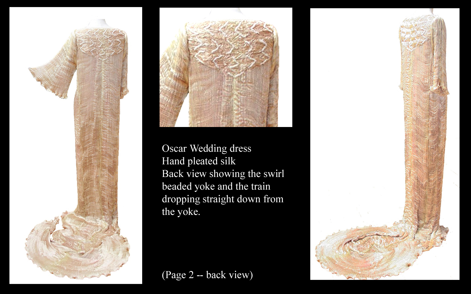 The variety of dresses, jackets and outfits range from simple sophisticated styles suitable for all age groups and shapes and sizes – to the more creative pieces. The interest in the Pre-Raphaelite period can be re-invented with any of the pleated dresses (as featured in the film: Wings of the Dove) – in turn they can be sharply contemporary and futuristic.