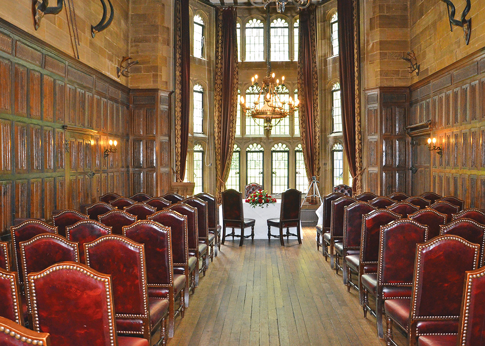 We have three licensed ceremony rooms - The Drawing Room, the striking wood-panelled Baronial Hall and the terraced Floyd room, accommodating parties of up to 120 for a ceremony, 170 for a wedding breakfast and 220 for an evening reception.