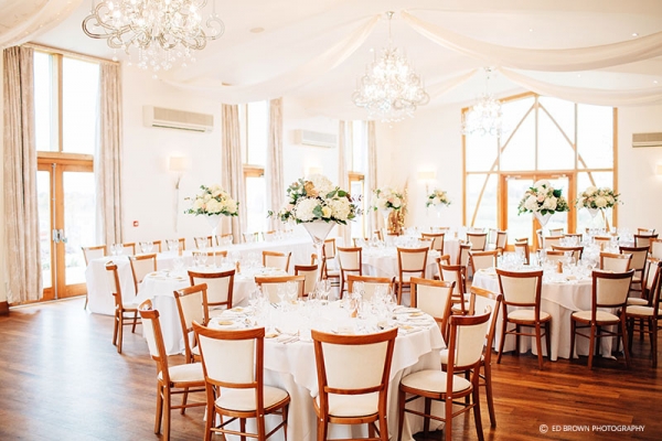 Welcome drinks and canapés can be served in the connecting Cart Barn or outside in the beautiful Courtyard, with delicious treats and exemplary service from the on-site catering experts. The contemporary Grain Store was designed with the wedding breakfast in mind. Floor-to-ceiling windows open onto the garden and views beyond, making this a wonderful setting for both summer and winter celebrations. Elegant décor includes stylish chandeliers and ceiling drapes, offering every couple a neutral colour palette upon which to impart their chosen style. As the sun goes down, this versatile space becomes your party venue with ample space for a band or DJ to entertain you and your guests.