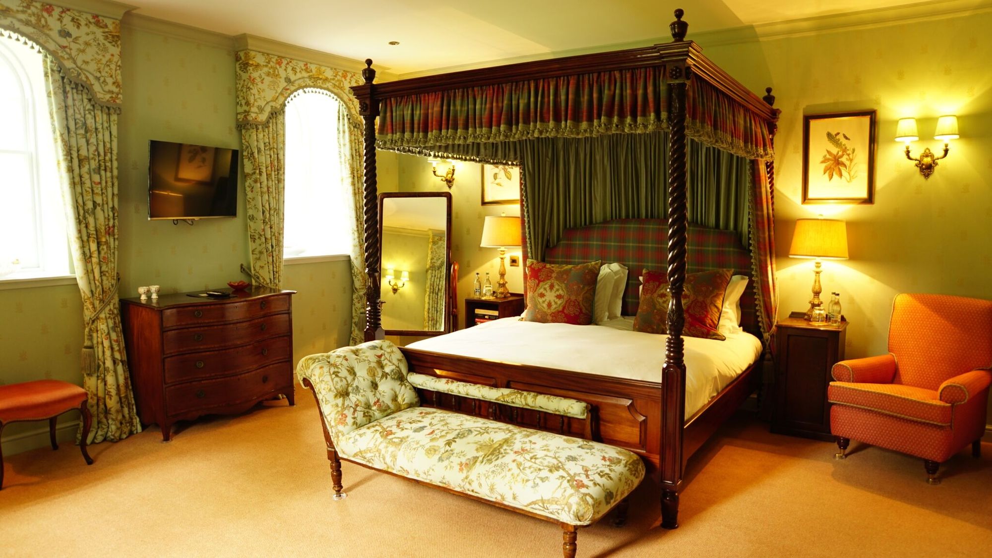 The Coach House comprises a dramatic double height hall complete with intricately painted ceiling, a striking tartan library bar with mezzanine, a courtyard complete with doocot, a walled garden and ten en-suite double bedrooms with interiors designed by Royal Warrant Holder Mikhail Pietranek. Access to the formal gardens, with views across Loch Leven to the Island and Loch Leven Castle, can be arranged as part of your hire.