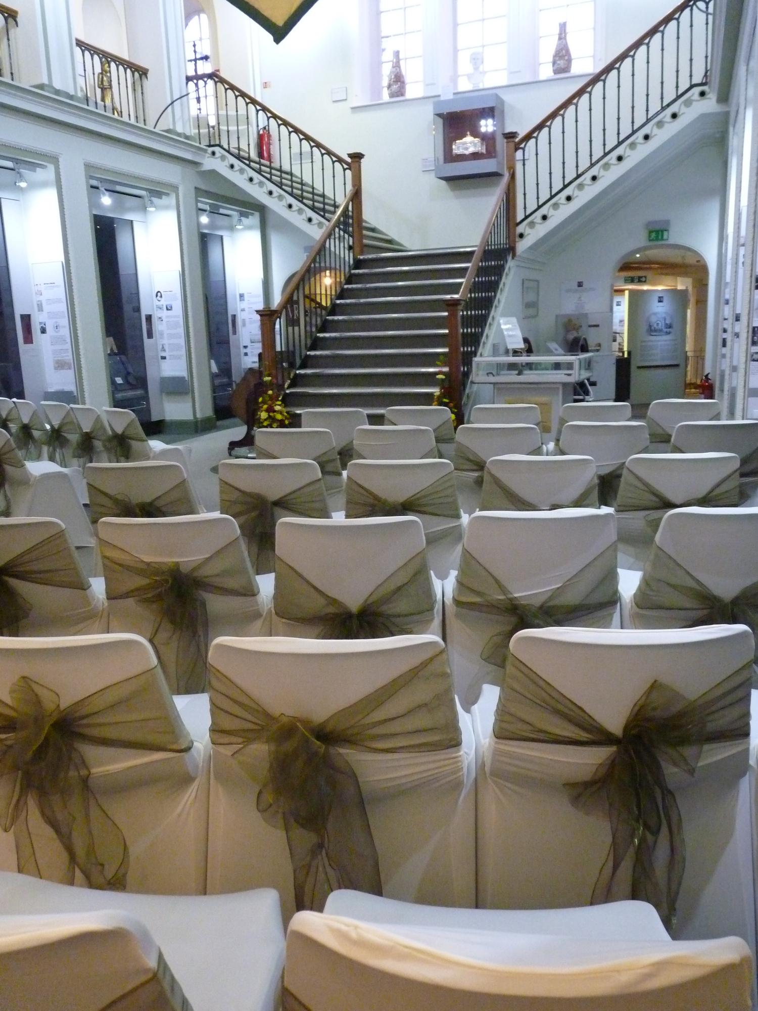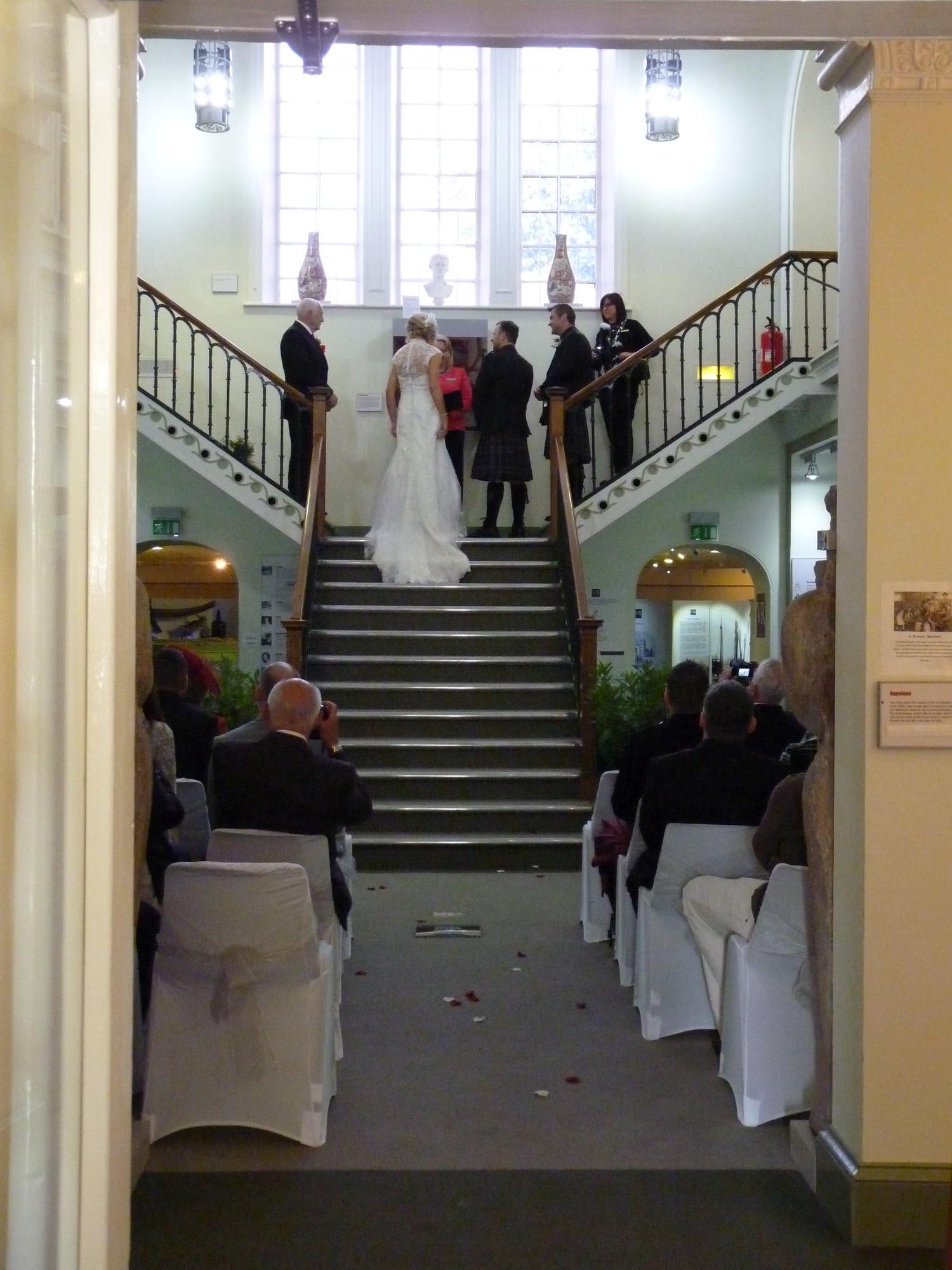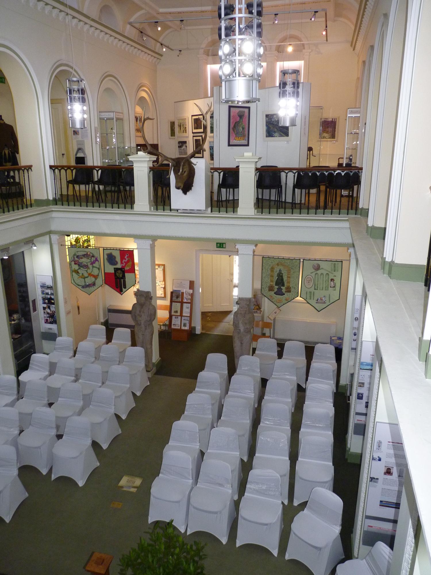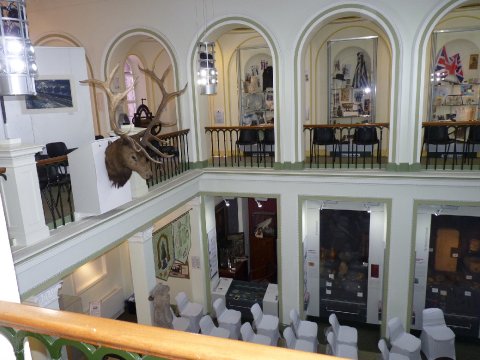 Elgin Museum is the oldest independent museum in Scotland. It was built in 1843 in the Italianate style and is a listed building. It is a beautiful place for a most unusual wedding ceremony, with a sweeping T- shaped staircase to the upper level, giving a wonderful setting for photographs. The surrounding area is suitable as a backdrop for pictures, especially the Little Cross (a Medieval gathering place) which is opposite. Elgin Cathedral and the Cooper Park are a short distance away. The Main Gallery can seat up to 70, with space on the mezzanine level for a further 20 (approximately, depending on seating arrangements). We can supply seats and cream covers with green organza sashes. Although we do not have facilities for catering, there is space in the rear gallery and the side hall for a champagne buffet, for after the ceremony. Our volunteers are happy to help with arrangements, given enough time, and the final price would depend on your requirements. Elgin Museum is a perfect venue for couples wishing a small, unusual wedding which is cost effective.