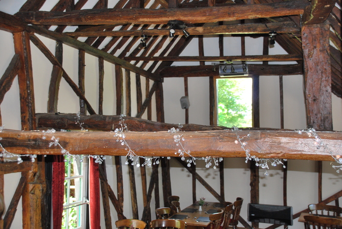 Our charming reception venue is a traditional oak beamed barn, which features vaulted ceilings and aspects over our garden and the Sarratt countryside, seats up to 42. The barn exudes atmosphere and allows your wedding reception to take place all under one roof. It features a seated table area, which can be used for a party as well if you wish, and a sun terrace if the weather allows.
