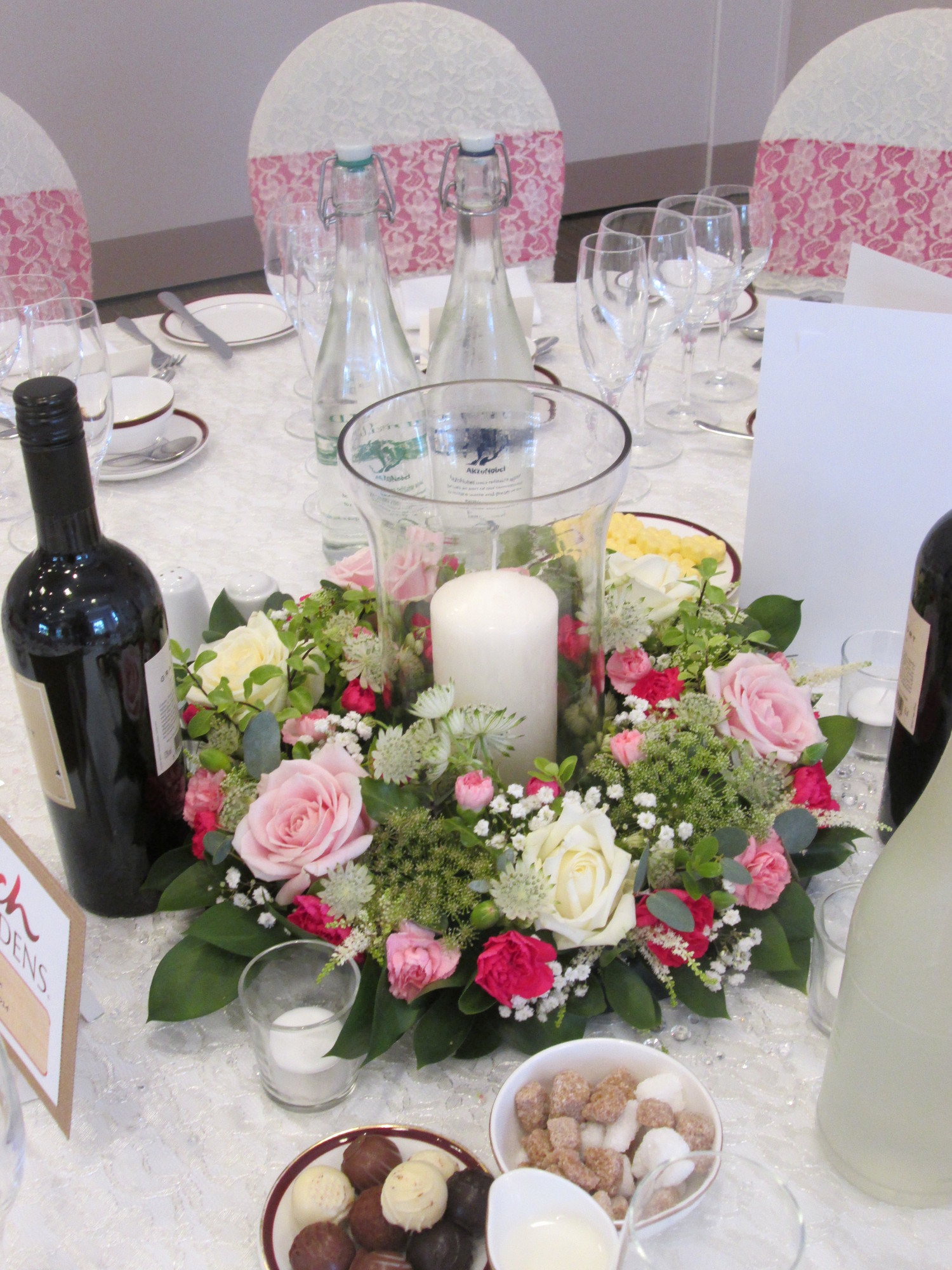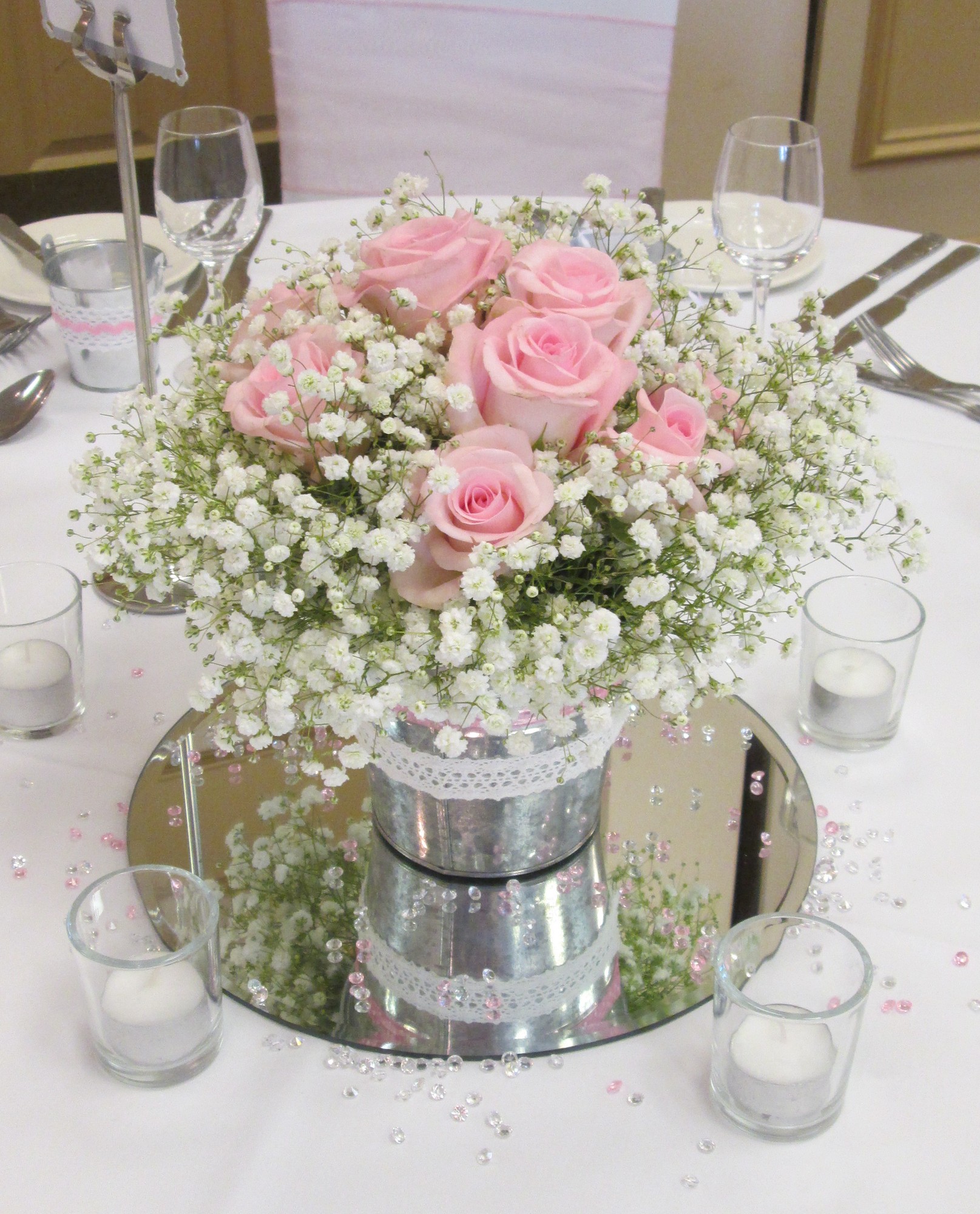 We offer great value for money and have flowers suited to every budget and we have no hidden extras so all table centres come with mirror or log base, tealights and crystals or petals, as standard. So contact us now and let's talk weddings and flowers!