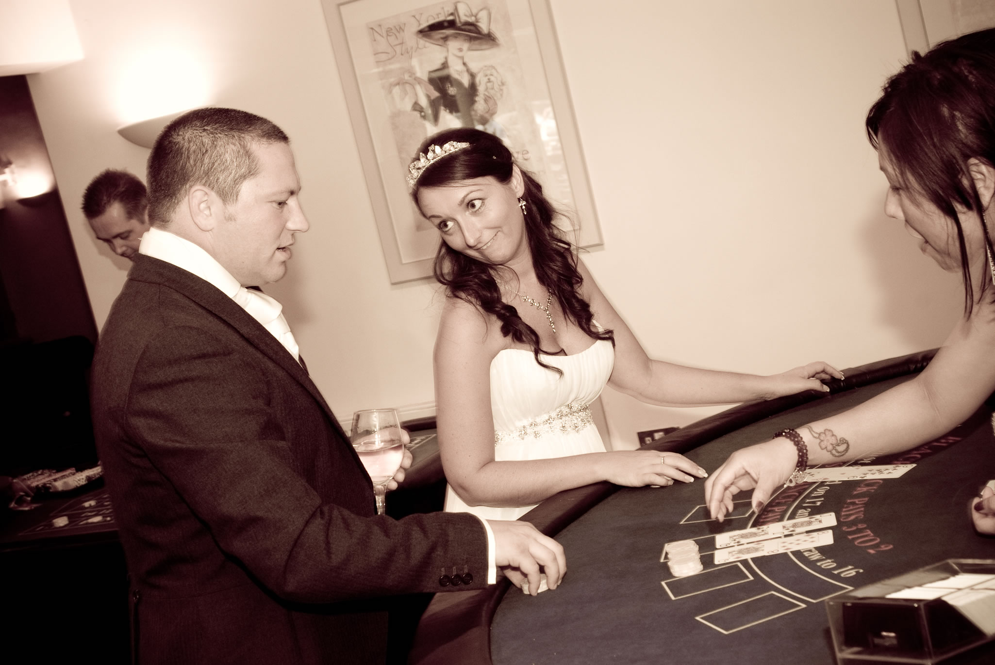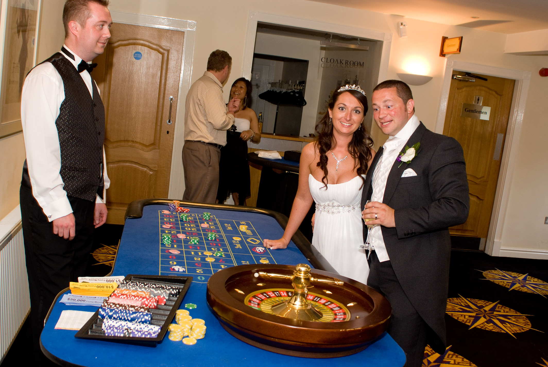 Casino Casino Casino provides the best in all forms of fun casino hire / entertainment. A glamorous evening of fun and laughter for any amount of guests, offering a luxury fun casino for your wedding. We have a wide range of differently sized tables ranging from 3/4 size up to full sized tables (as seen in a casino). Our casino tables include professional croupiers and fun money as well as a whole host of optional extras.