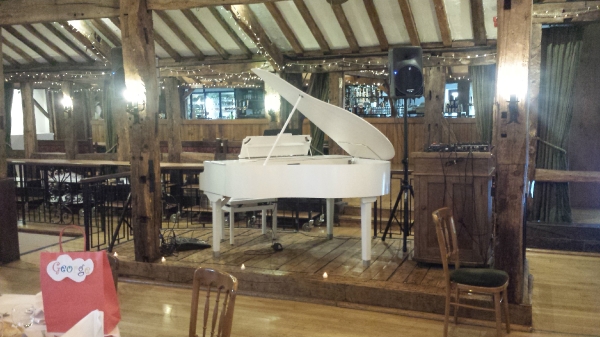 Vanessa has a white grand piano shell, candelabra and lights to enhance the look of the music.