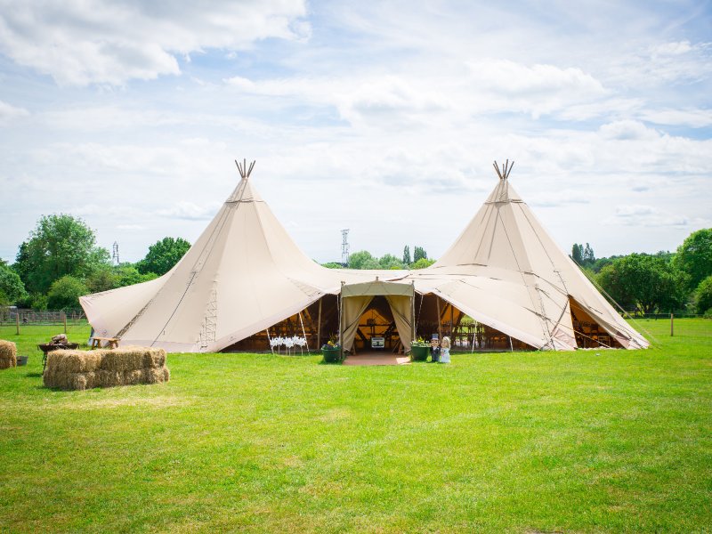 The double linked tipi sits in a large field overlooking beautiful farmland. The tipis come complete with flooring, lighting, tables, benches and chairs. You can decorate both the tipi and the main building however you want, as long as it is returned back to its original state for Sunday evening. Access for decorating the tipi is fromThursday of the week of your wedding.